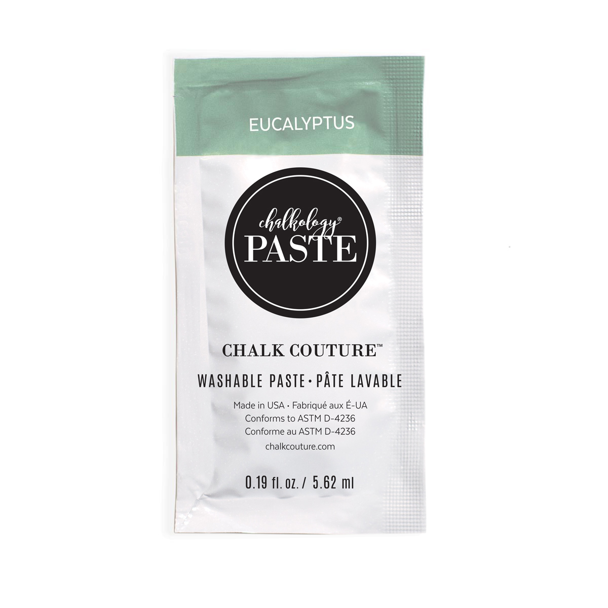 Make a statement with creamy dreamy™ Eucalyptus Chalkology® Paste! Perfect for hard surfaces. It’s washable, forgiving when wet, and offers a hard, matte finish. Chalkology Paste Singles include .19 US fl. oz. Chalkology Paste is formulated for use with Chalk Transfer® designs and Chalk Couture™ surfaces. Can also be applied to other nonporous surfaces.