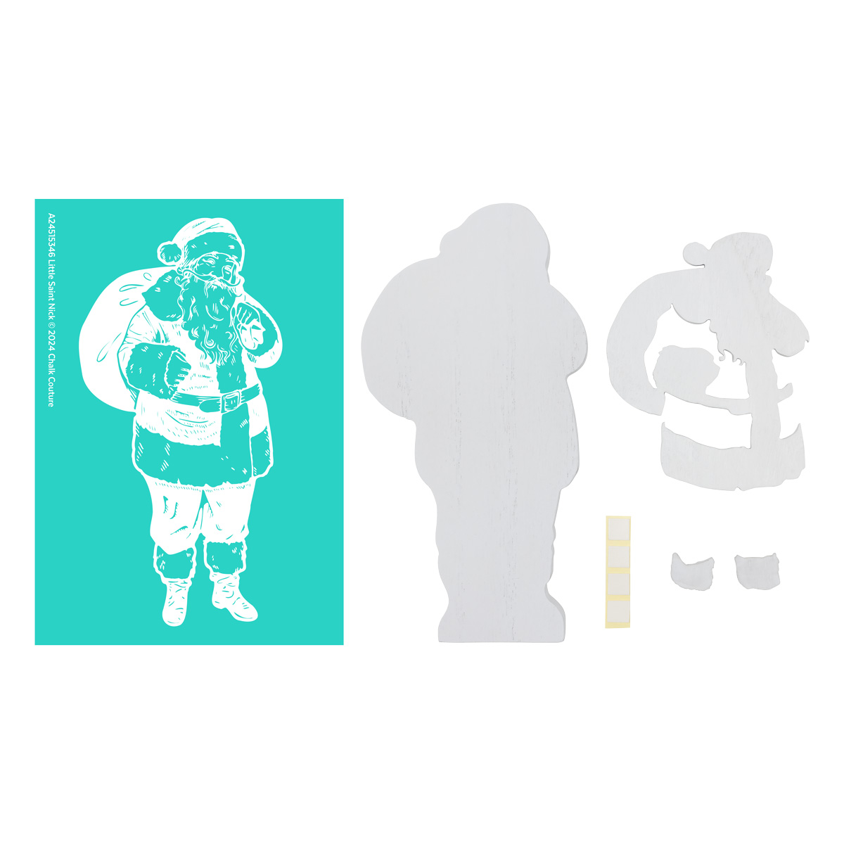 It's little Saint Nick! Really, we mean it, he's little! Feature the man of the hour in your cute Christmas vignette. The following items are included in this bundle:- Little Saint Nick Chalk Transfer® design- Little Saint Nick Cutout (one-time use, measures approximately 3¼" x 6¼" x ¾")- 3 accent pieces- 4 adhesive squares