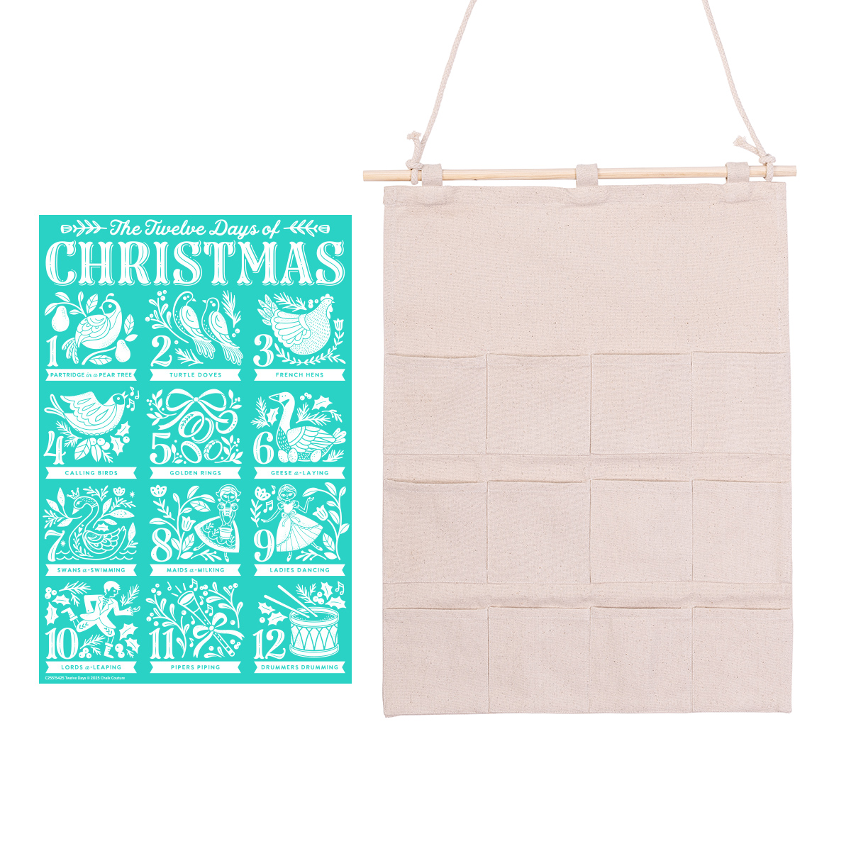 "For an advent calendar like no other, this project has ""new tradition"" written all over it! The Twelve Days Chalk Transfer® design and a Hanging Organizer are included in this bundle. The Hanging Organizer measures approximately 20"" x 26½"" overall, with each pocket measuring approximately 5"" x 5"". The organizer's rope is 54"" long and the wooden rod is 21¼"". It is made of 70% cotton and 30% polyester. This product is crafted from natural fibers, which may result in unique variations in color and texture."